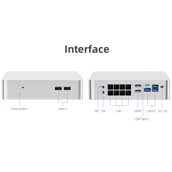 This Industrial Mini PC features a well - designed interface layout. On one side, you’ll find the power button and USB 2.0 ports for basic control and simple device connections. The other side is more versatile: LAN ports enable stable network access, HDMI supports display output, USB 3.0 and USB Type - C offer high - speed data transfer, and MIC/SPK ports handle audio input/output. These interfaces make it easy to integrate into industrial setups, connecting to various peripherals for seamless operation.